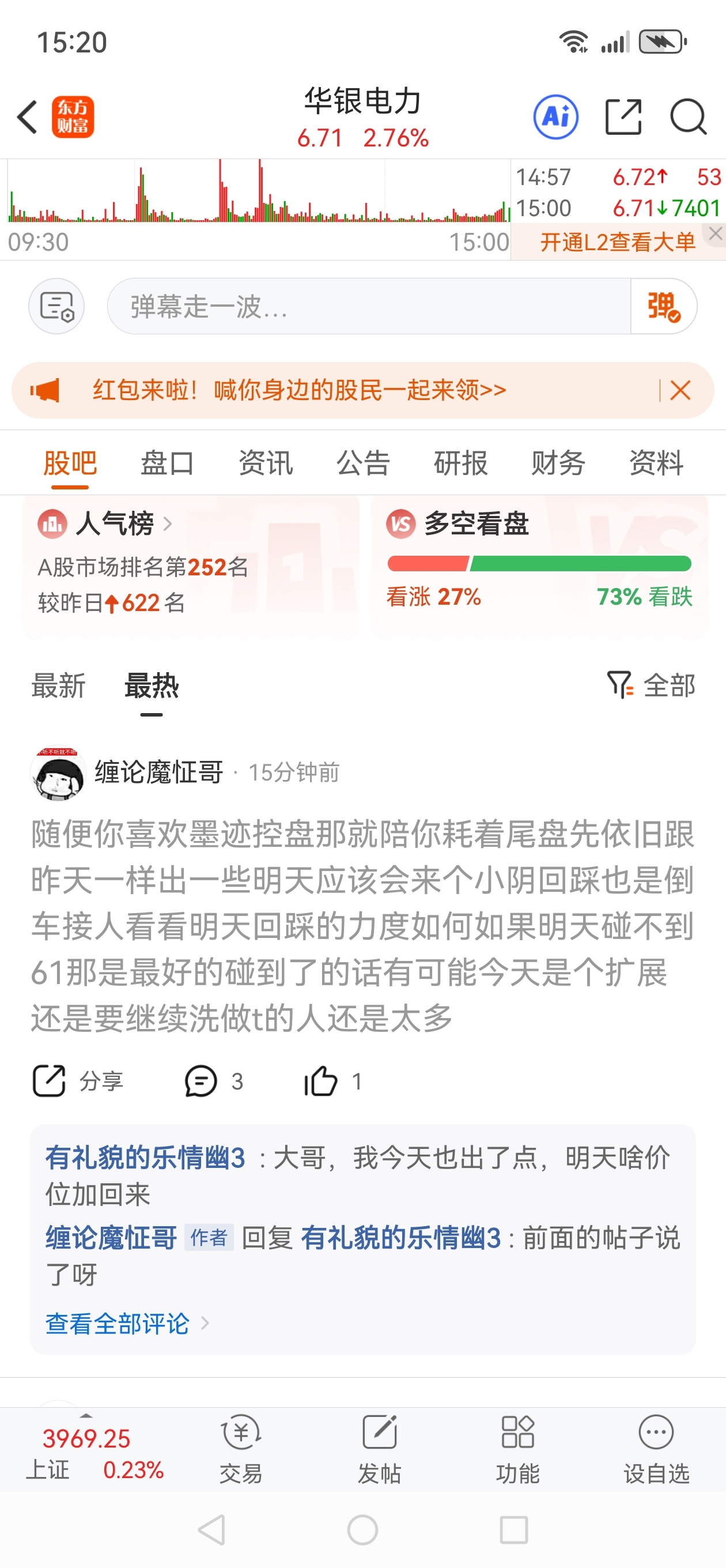 $华银电力(SH600744)$ 连着2天看空的多,他就涨了,今天热度排名又200多了,明天又危险了。大家进吧就点那个看跌,别点看涨