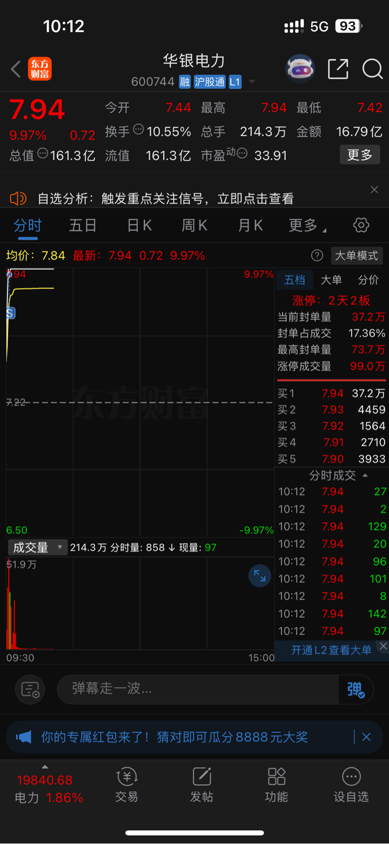 华银第一次砸盘我肯定不摁,因为豫能在冲板中。豫能封板砸盘,华银跟随的再次砸盘我摁慢了,还是9.56个点成交的