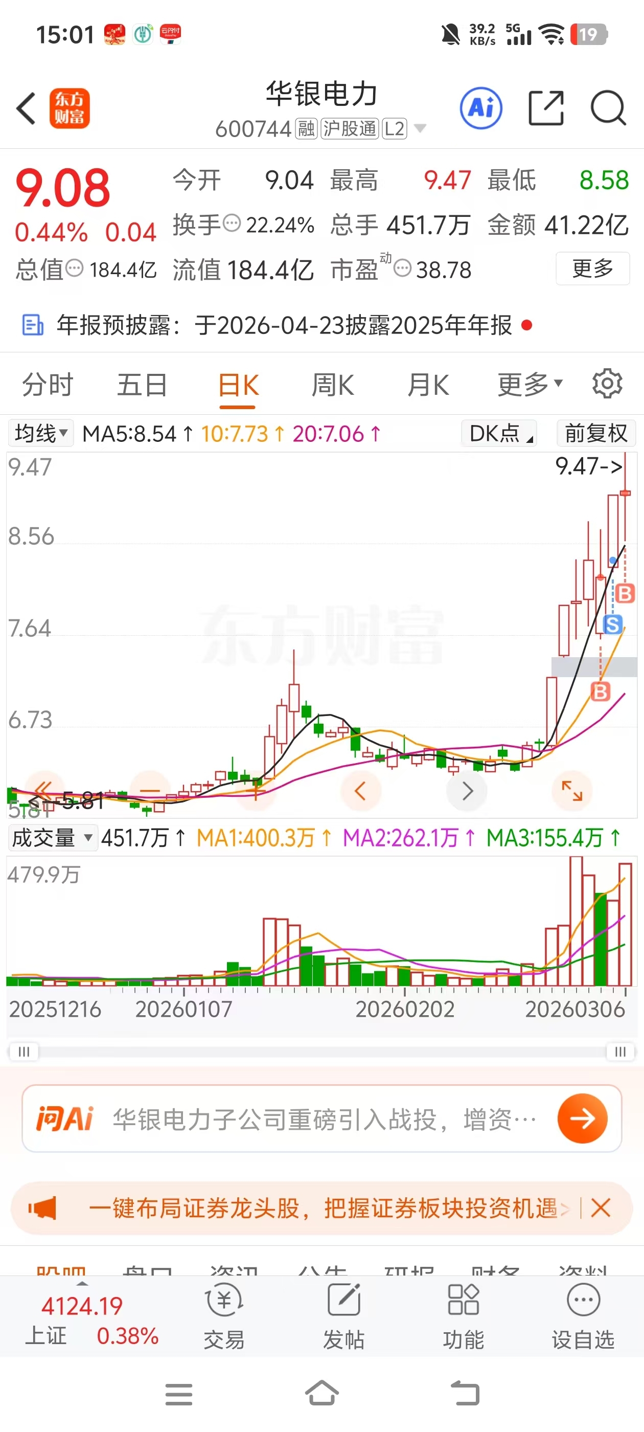 $华银电力(SH600744)$ 等了半天山东墨龙,结果没有跳水,于是只能放弃。没办法,尾盘再次介入华银电力。(个人观点,切勿模仿)