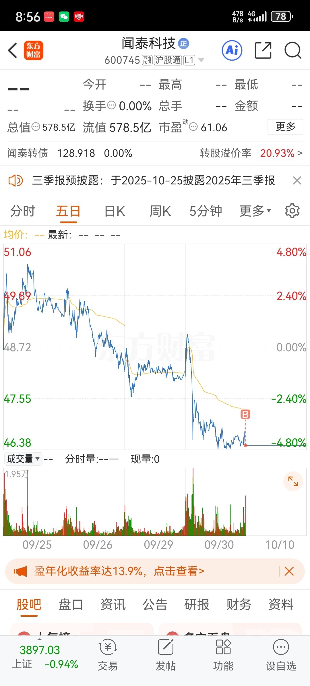 $闻泰科技(SH600745)$ 诶,尾盘刚买,你就来个累,明天能出去吗?天都踏了