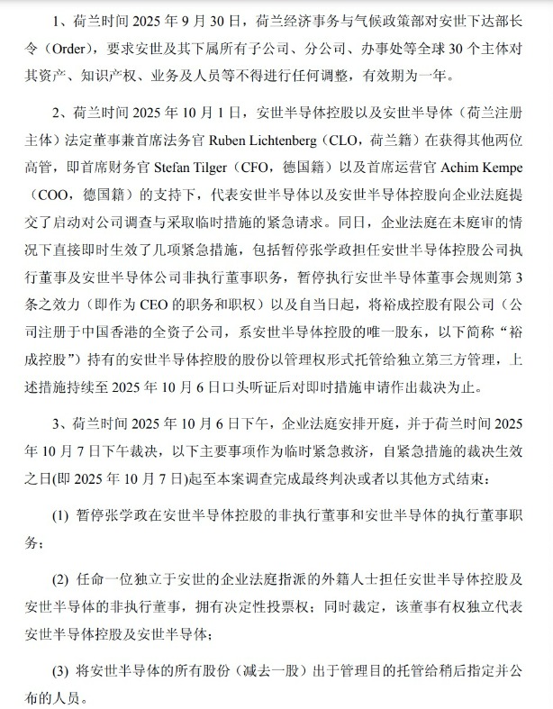 随后,当地时间10月7日下午,阿姆斯特丹上诉法院企业法庭(简称“企业法庭”)裁决,暂停张学政在安世半导体控股的非执行董事和安世半导体的执行董事职务;任命一位独立于安世的企业法庭指派的外籍人士担任安世半导体控股及安世半导体的非执行董事,拥有决定性投票权;同时裁定,该董事有权独立代表安世半导体控股及安世半导体;将安世半导体的所有股份(减去一股)出于管理目的托管给稍后指定并公布的人员。