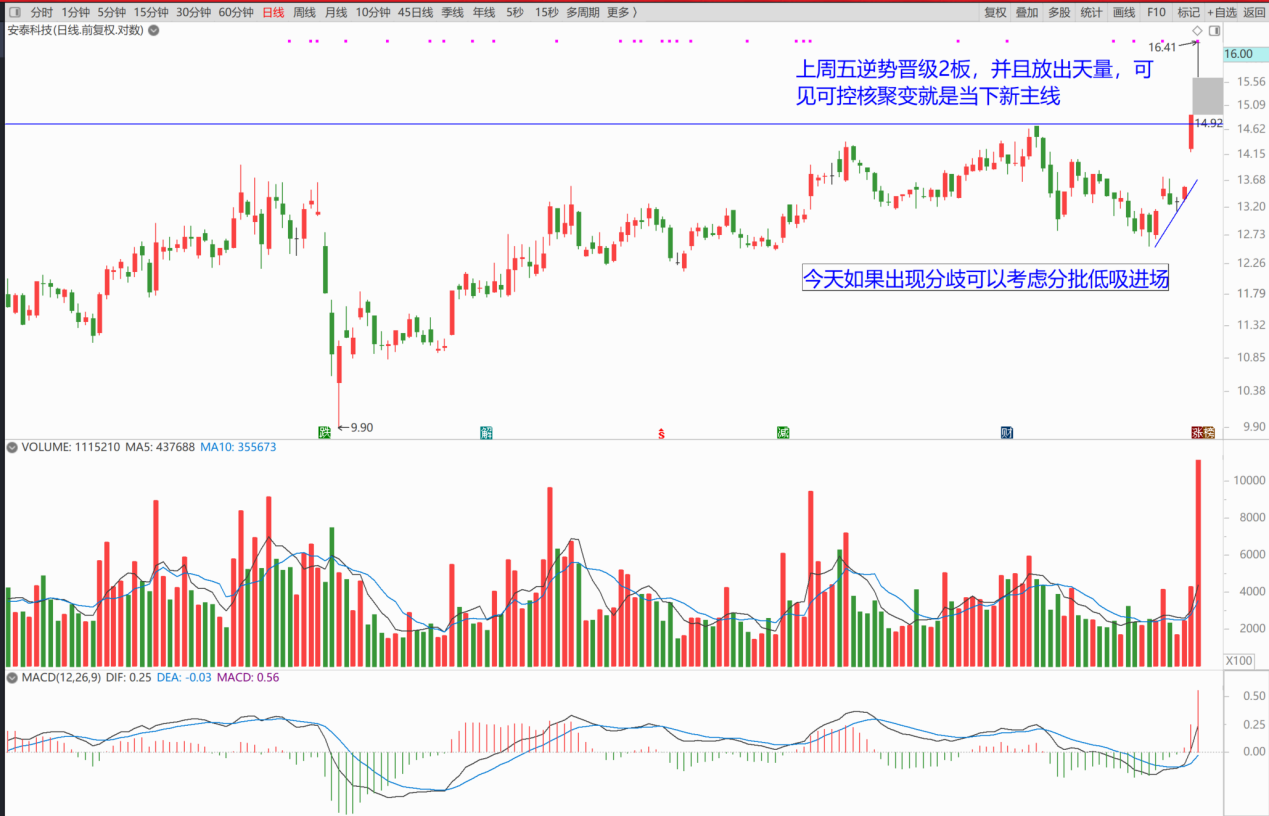 技术面:上周五放量涨停, 晋级2板,并且成交量放出天量。在大盘整体走调整的情况下依然能够强势拉升逆势连板,说明可控核聚变的题材是得到大紫金认可的。今天看有没有分歧机会,如果分歧计划分批低吸进场。