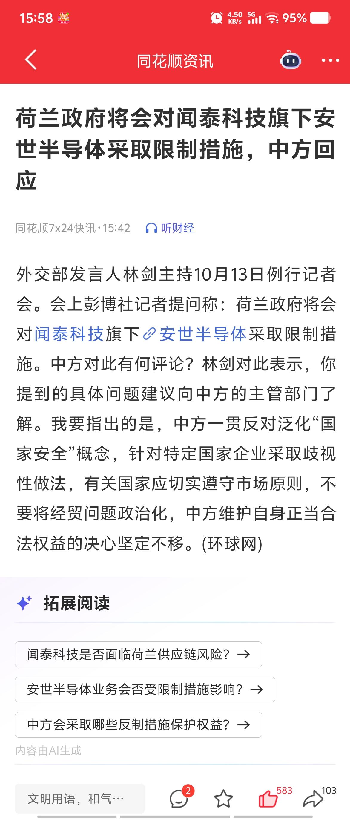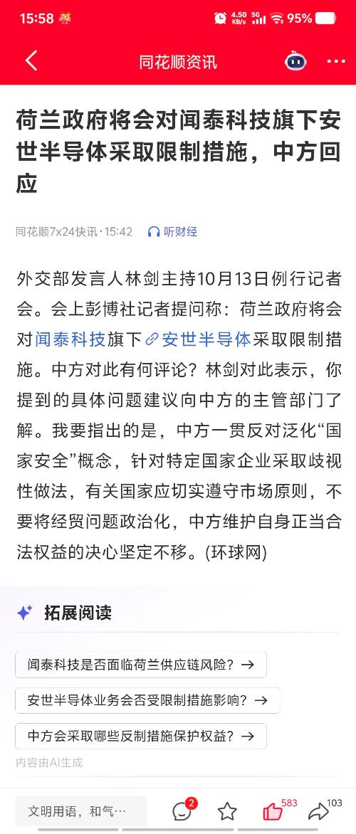 29号老美发布说穿透制裁,这个时候闻泰肯定受到波及,因为前一次制裁闻泰直接卖了起家业务。有了这次教训,既然你穿透制裁,公司没法避开,那有什么办法解决呢? 那暂时主动的让出控制权,你就穿透不到我,影响不了公司正常业务,那怎样再你还没有对我开始打击的时候,就要主动出击,所以就有了公司外国高管向法庭提请了审查请求,法庭裁决1年期的控制权交由指定人员管理。只有这样安世业务不会被穿透影响到! 不然安世也没有活路了!