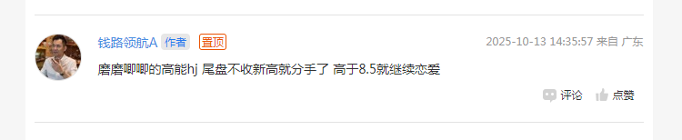 这只是盘前圈好的 “马前炮” 标的,周末外围下行,本来都做好它低开较多的准备了,低开幅度符合预期,没犹豫,直接地洗,全天都在均线附近震荡,量能跟昨天差不多,最后还收了根红 K—— 这可不是弱势讯号,反而说明当前是弱调整,上行趋势没坏。明天留意 “能不能创新高”:要是开盘后能放量冲过近期高点,就说明趋势彻底稳住了,能继续恋爱;要是还是磨磨唧唧,甚至低开往下砸,先分手,弱势盘里能抗的,后续反弹概率更大。