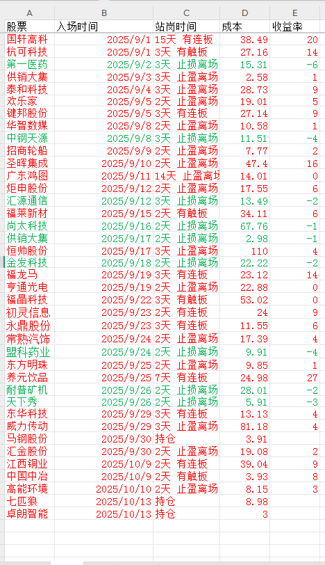 昨天地洗后还盼着今天能冲一波,结果今天竞价就随着大盘低开,早盘虽然弱势上行,午盘也有所回升,但始终没超过昨天8.5的高点 —— 这就说明短期上行力度不够,没犹豫,尾盘竞价直接分手了。你可别觉得 “再等等说不定能突破”,咱提前定好的 “不超高点就分手”,就得落实,弱势盘里别抱侥幸心理。