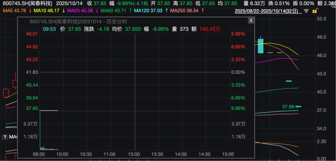 受此消息影响,闻泰科技股价10月13日一字跌停,今日开盘再次一字跌停。