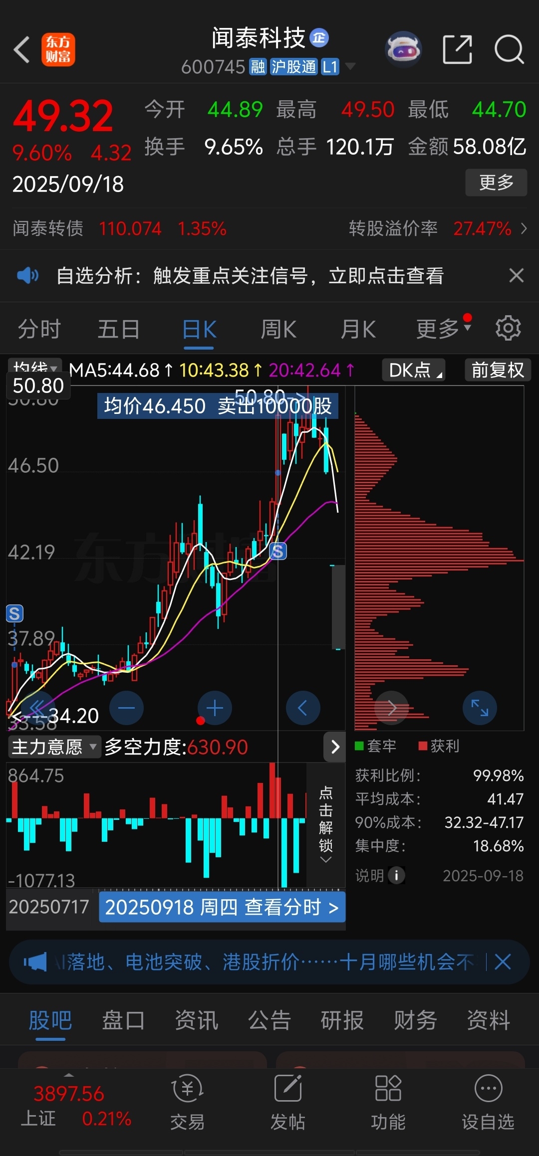 $闻泰科技(SH600745)$ 当天涨停49.5,46.4卖了,还拍大腿卖早了。现在想想,庆幸卖了。