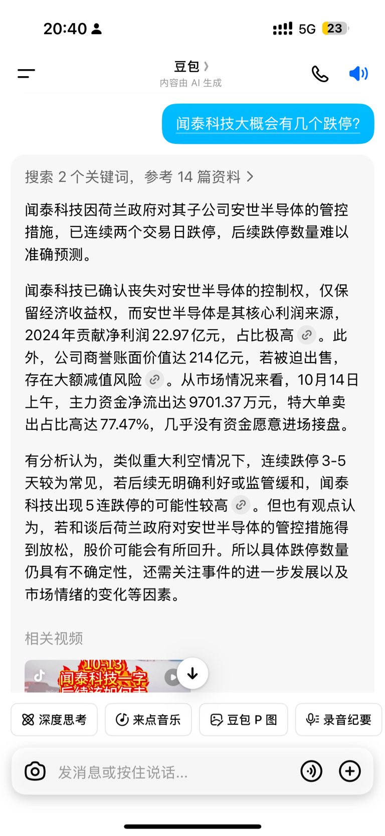 $闻泰科技(SH600745)$ 问了豆包说五个跌停的概率很大,怎么办,我的20万在里面出又出不来,已经亏了好几万了
