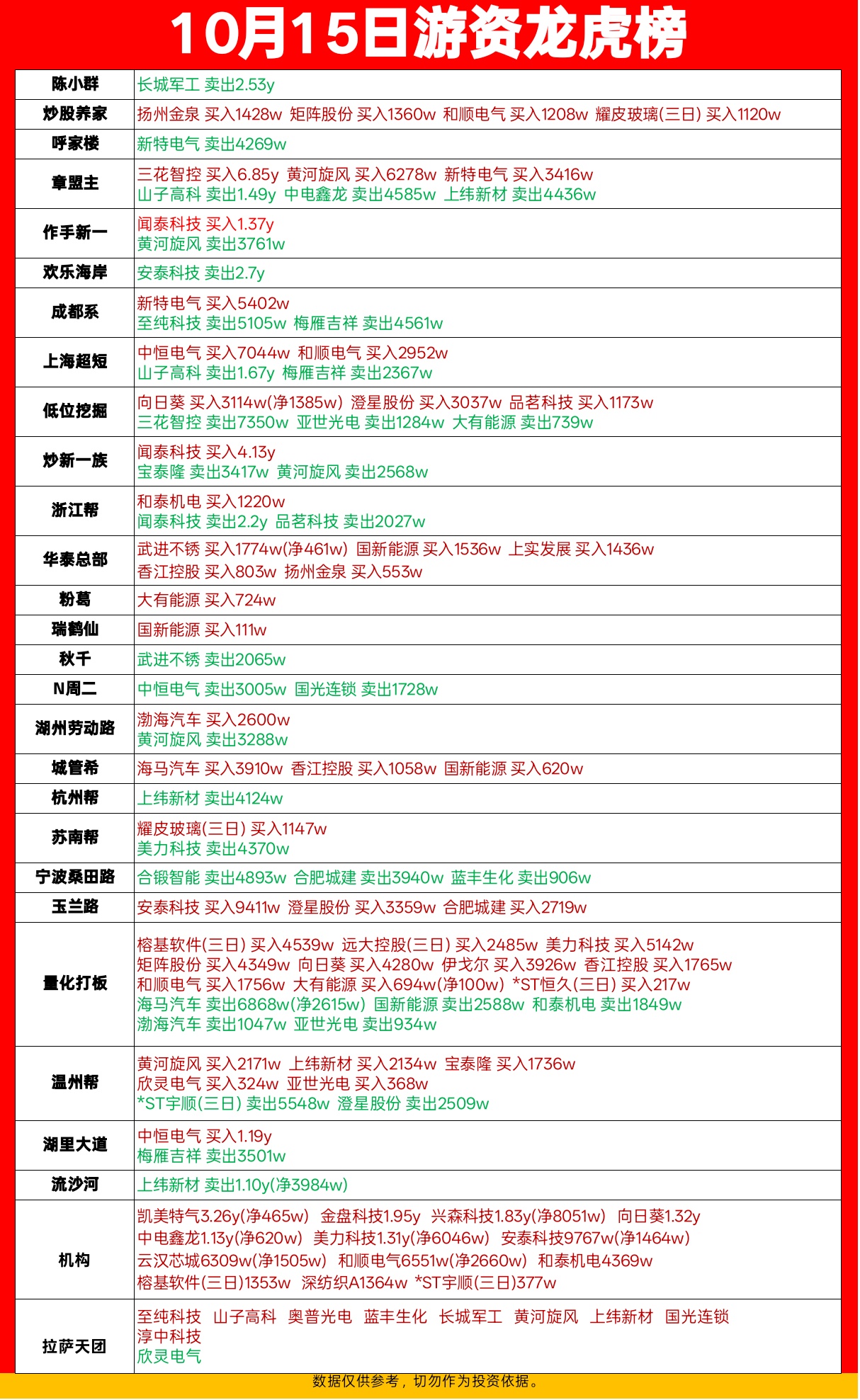 10.15游资龙虎榜,陈小群章盟主呼家楼上榜。