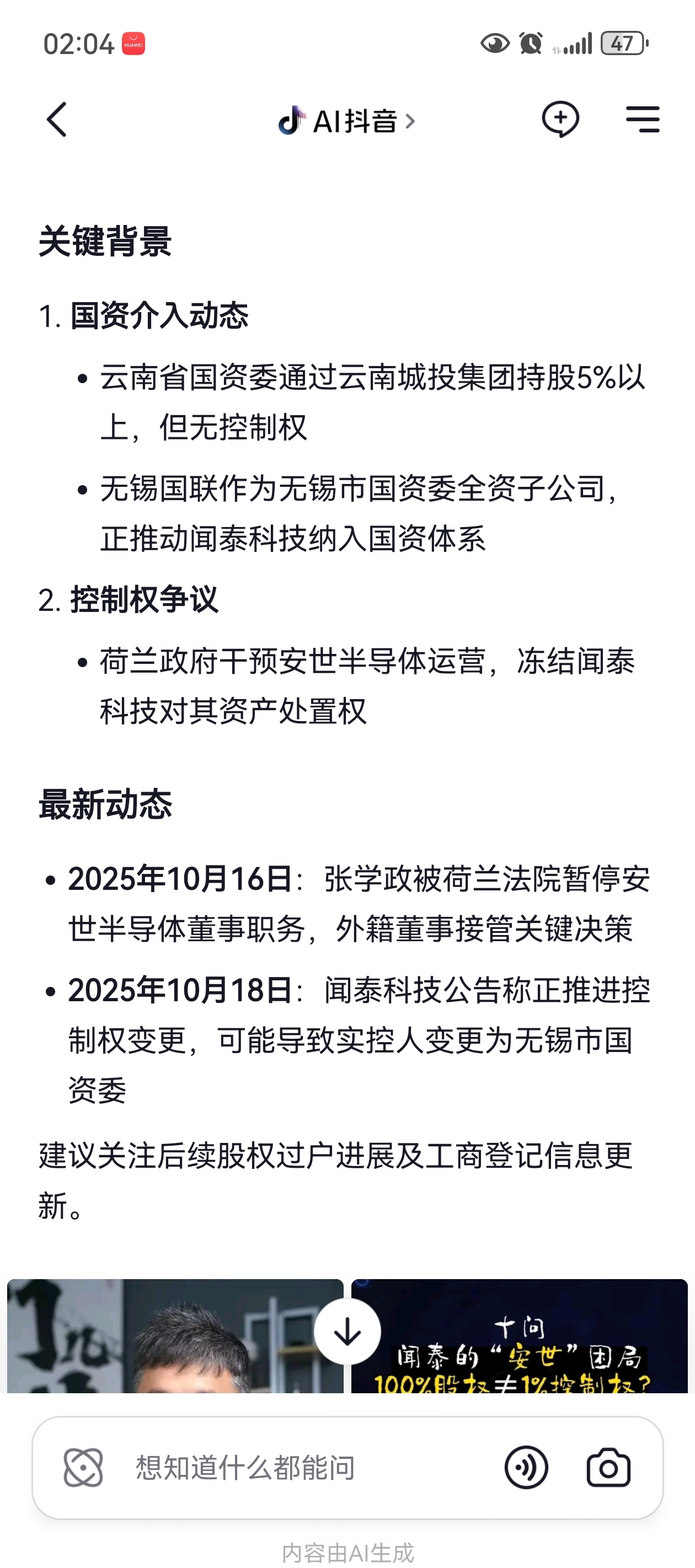 $闻泰科技(SH600745)$ 2025年10月18日:闻泰科技公告称正推进控制权变更,可能导致实控人变更为无锡市国资委