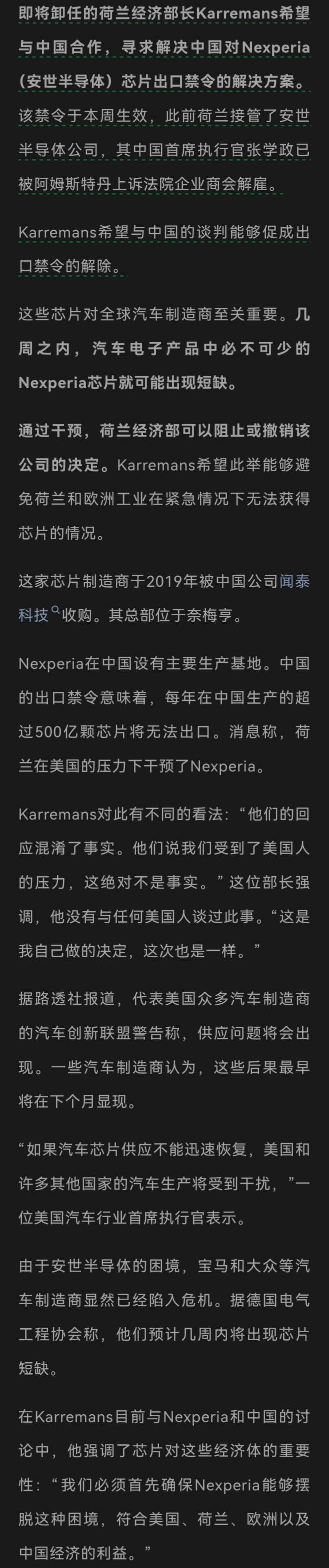 $闻泰科技(SH600745)$ 最新:安世半导体事件,荷兰希望与中国磋商!荷兰经济部长Karremans希望与中国合作,寻求解决中国对安世半导体芯片出口禁令的解决方案。该禁令已于本周生效。此前荷兰接管了中国闻泰科技公司旗下的安世半导体公司,其中国首席执行官张学政已被阿姆斯特丹上诉法院企业商会解雇。Karremans希望与中国的谈判能够促成出口禁令的解除。