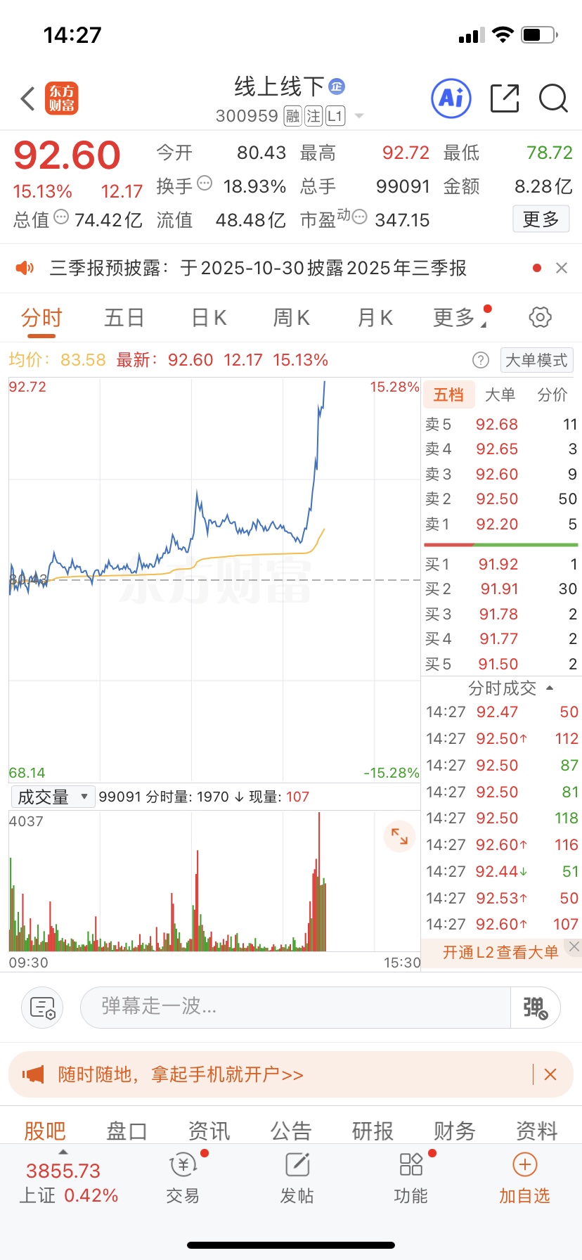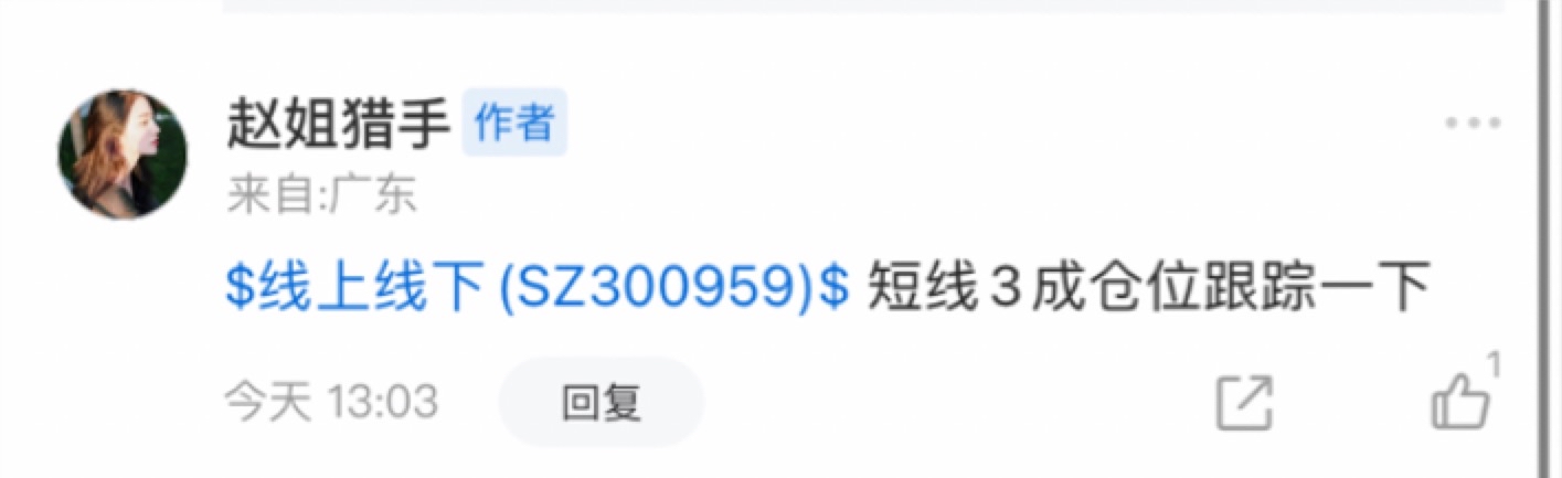 我们午盘分享的$线上线下(SZ300959)$强势拉升15个多点,点点赞关注评论666,祝你祝我 我们一起六六大顺!