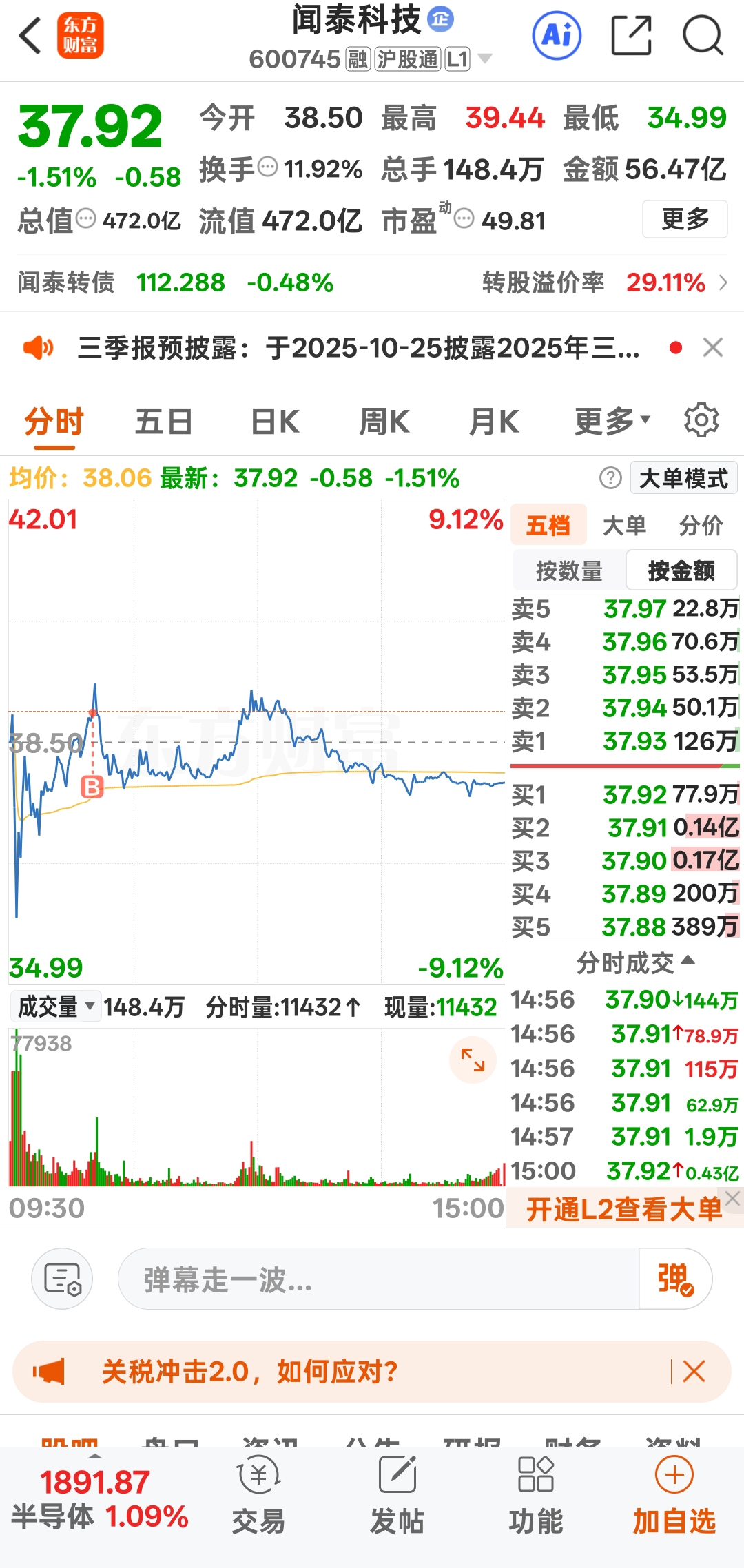 $闻泰科技(SH600745)$ 本以为可以反核涨停的,冲高回杀承接性较弱