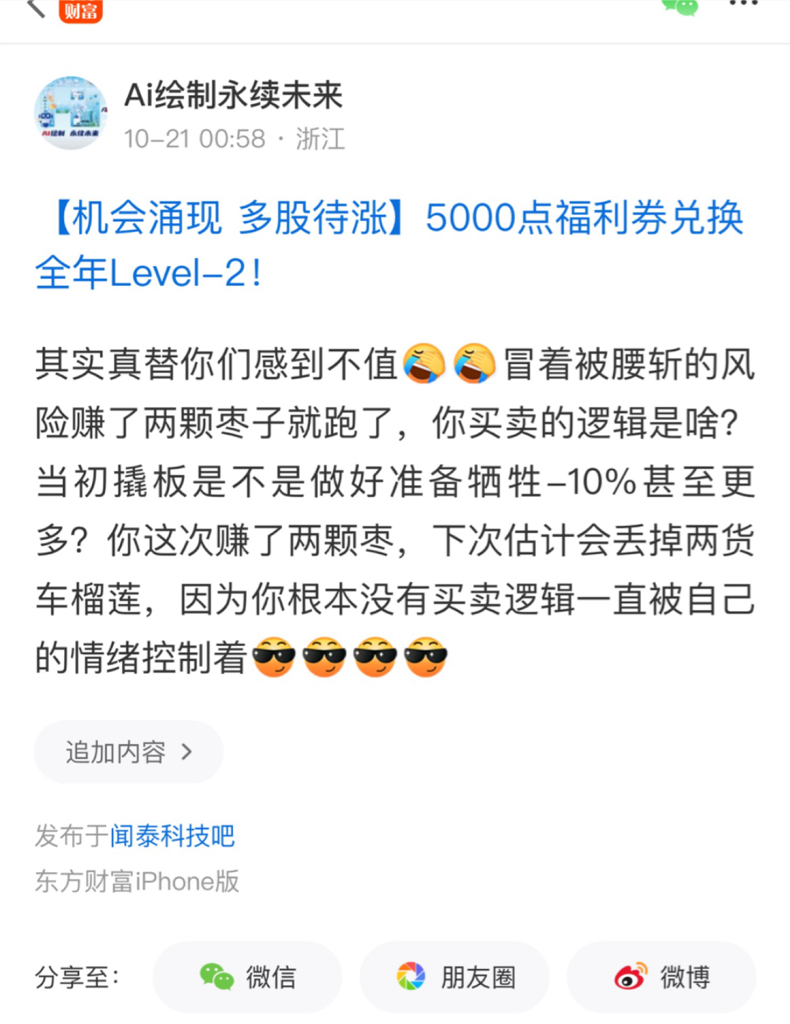 温馨提示: 1.根据《证券法》规定,禁止编造、传播虚假信息或者误导性信息,扰乱证券市场;2.用户在本社区发表的所有资料、言论等仅代表个人观点,与本网站立场无关,不对您构成任何投资建议。用户应基于自己的独立判断,自行决定证券投资并承担相应风险。《东方财富社区管理规定》