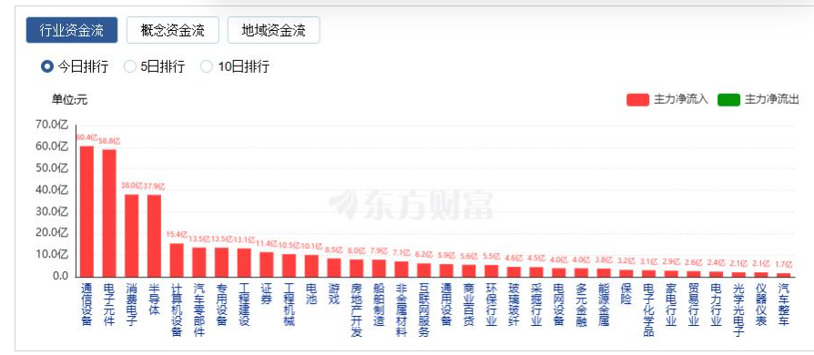 行业板块呈现普涨态势,采掘行业、工程机械、电子元件、船舶制造、房地产开发、消费电子、非金属材料、贸易行业涨幅居前,仅煤炭行业、燃气、贵金属板块逆市下跌。深地科技概念持续走强,神开股份、石化机械双双2连板。CPO概念股全天走强,“易中天”光模块三巨头震荡拉升,源杰科技触及20cm涨停创历史新高。苹果产业链表现活跃,环旭电子涨停,工业富联接近涨停。 行业紫金方面,截至收盘,通信设备、电子元件、消费电子等净流入排名靠前,其中通信设备净流入60.37亿。
