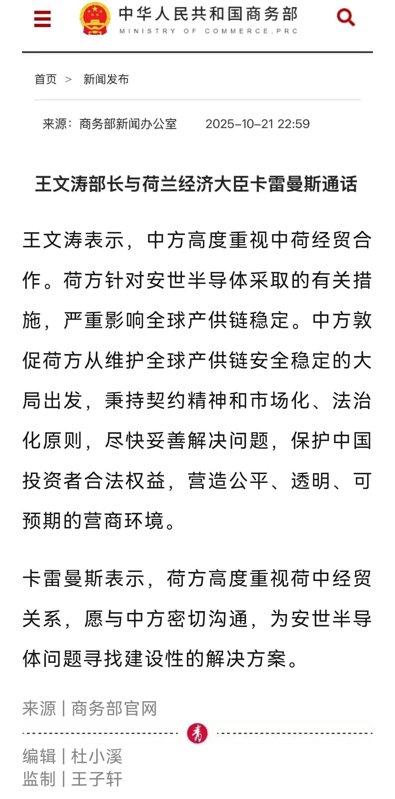 $闻泰科技(SH600745)$ 王文涛表示,中方高度重视中荷经贸合作。荷方针对安世半导体采取的有关措施,严重影响全球产供链稳定。中方敦促荷方从维护全球产供链安全稳定的大局出发,秉持契约精神和市场化、法治化原则,尽快妥善解决问题,保护中国投资者合法权益,营造公平、透明、可预期的营商环境。卡雷曼斯表示,荷方高度重视荷中经贸关系,愿与中方密切沟通,为安世半导体问题寻找建设性的解决方案。