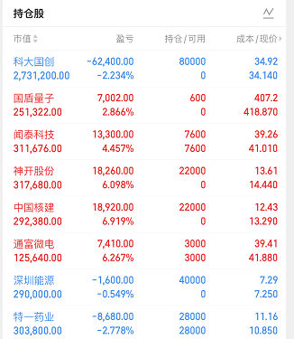 科大国创 $科大国创(SZ300520)$,国内电信量子研究院团队近日在光通信领域也取得了重要进展,成功实现了超过 80 公里的经典光信号与量子密钥分发共纤传输现网实验,传输速率超过 10Tb/s。公司参股投资国仪量子,持有国仪量子 2.75% 股权。国仪量子是一家以量子精密测量和量子计算为核心技术的高科技企业,为全球范围内的企业、政府、研究机构提供以增强型量子传感器为代表的核心关键器件,拥有国际领先的科学装置平台和更高精度、更高分辨率的量子传感器等技术及产品。公司主营业务是行业软件的研究、开发和销售,提供 IT 解决方案,以及相关的信息系统集成与技术服务,主要产品是电信运营支撑系统软件、金融资产管理软件、大数据应用平台方案、互联网 + 智慧物流云服务平台、新能源汽车电池管理系统。公司在智能汽车领域重点聚焦智能系列产品及动力电源总成系统的研发;公司自主研发了九章平台,还有科大国创聊天机器人系统。扫描电子显微镜、量子钻石单自旋谱仪、金刚石量子计算教学机等仪器装备已经进行市场化推广及应用。不过话说回来,持有国仪量子的股份并不高,算不上是特别纯正的量子科技标的。早盘我上车了,但是这票高开低走,差点就被套住了,还好最后稳住了点。