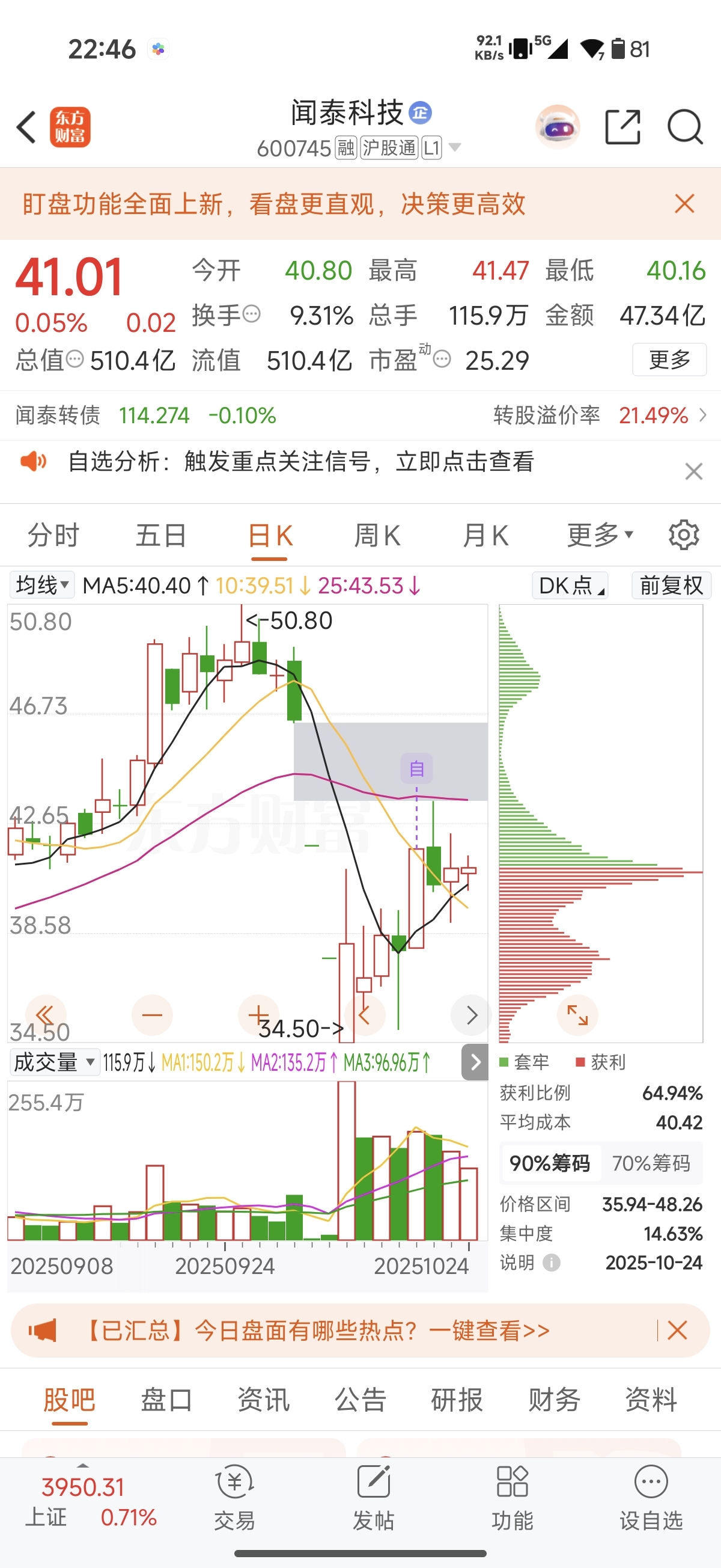 只看技术识别:第一次10.15跌停捞起来的当天算,后面连续三天都没有跌破10.15的最低位置,为有效突破,第二次10.21拉板突破,后面又三天没有跌破最低位置,再一次有效突破,突破后逐步缩量,日线的成交量买盘多卖盘少,MA5日上穿10日均线且连续两日,短线可能依旧会有动作,我为啥会发,因为我持有,目前还有8个点盈利,当然希望他能长远