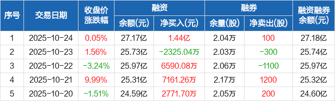 融资方面,当日融资买入5.49亿元,融资偿还4.05亿元,融资净买入1.44亿元。融券方面,融券卖出100股,融券偿还0股,融券余量2.04万股,融券余额83.66万元。融资融券余额合计27.18亿元。