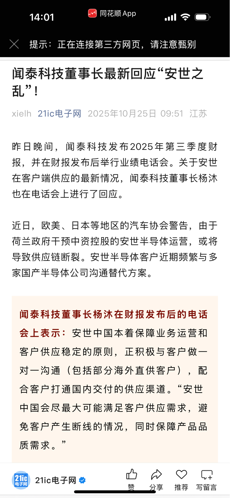 张秋明是安世全球销售与市场副总裁职务,现在公司正在配合客户打通国内交付供应渠道,包括部分海外直供客户。