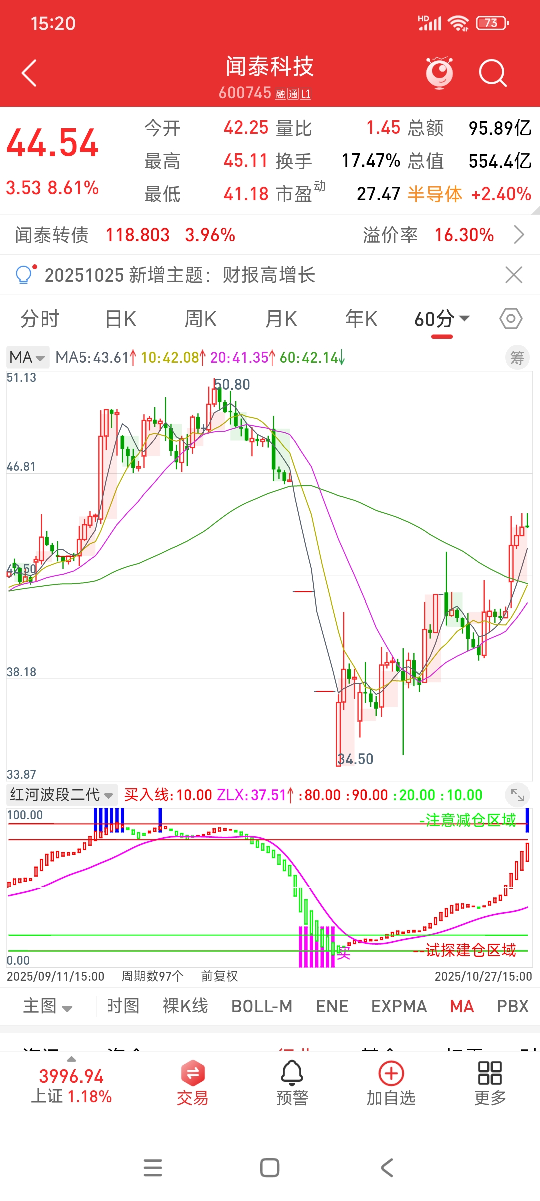 $闻泰科技(SH600745)$ 之前说过这个票出现60分钟反弹,毕竟60分钟就是底部出现买字加底部绿柱转红柱,所以一路上扬,红柱不停,上涨不止,红柱拉长,加速不止,这里还能继续冲,毕竟红柱还没缩短。