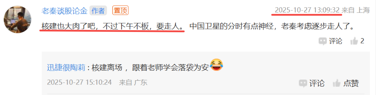 $中国核建(SH601611)$:盘前告诉大家了,这是比较标准的“空中加油”形态,周五跟随老秦介入的完全不用担心。开盘后果然迅速冲到了7%,没有封板实际上可以离场了,因为气势足却不板,暗示合力性有所欠缺。老秦分批走人的,这单刚好拿下10个点。老秦做事,讲究有始有终。既然带兄弟们上了车,就一定会为这趟旅程全程护航,力求让大家带着完整的收获离场。
