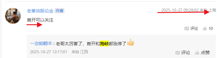海峡创新:上影高开的票,你都要注意,特别是新高位置的。结合日内热点,低吸的胜率很高。老秦在9:28分就在留言区提示了,别说没跟上哦,日内至少浮盈11个点才对。跟上老秦思路,就是这么爆炸,明天还有大肉可以计提呢,爽吧。