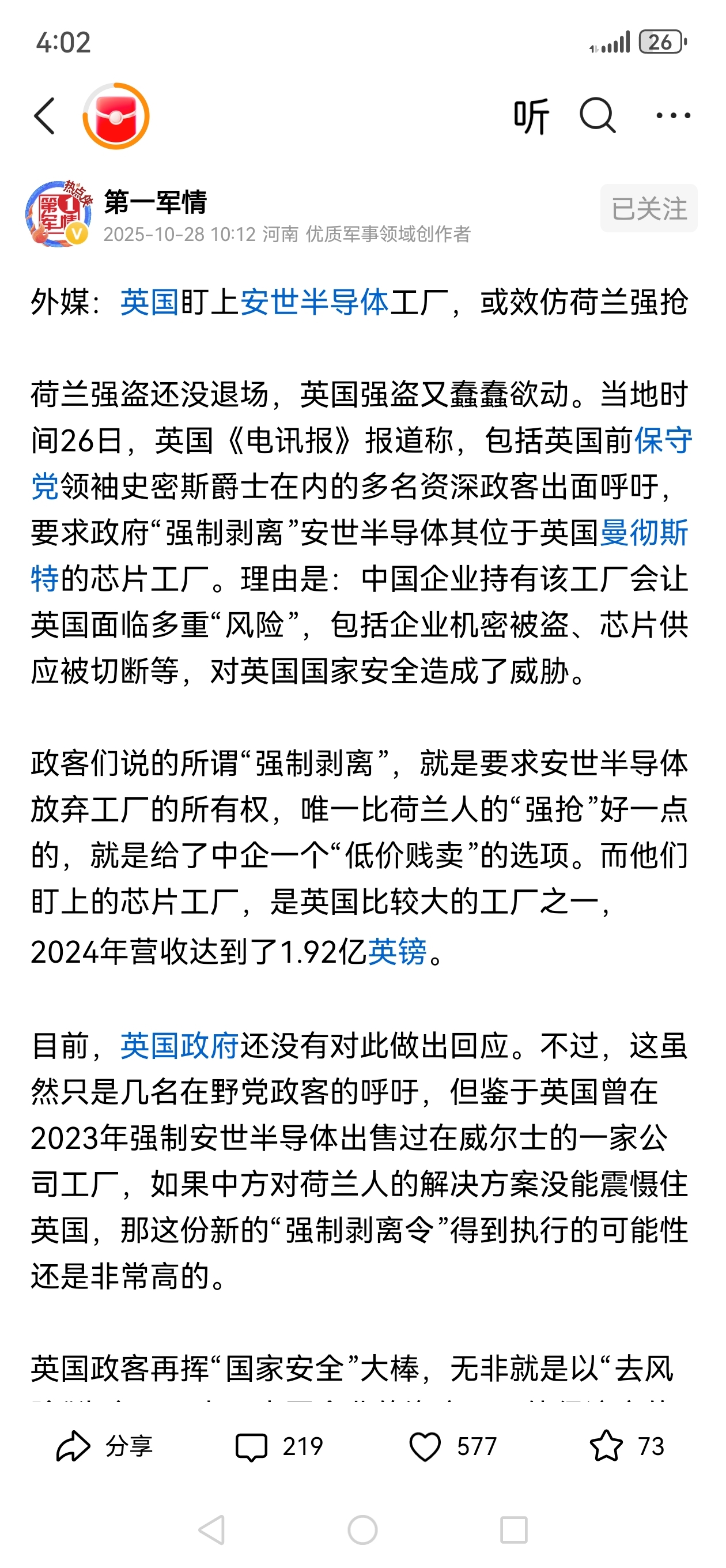 $闻泰科技(SH600745)$ 英国也盯上了安世半导体芯片工厂
