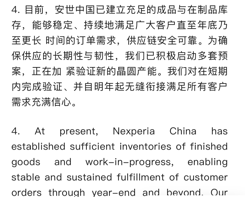 安世中国深夜加班发布公告,四季度库存充足业绩无忧,明年国产替代加速。极大提振了士