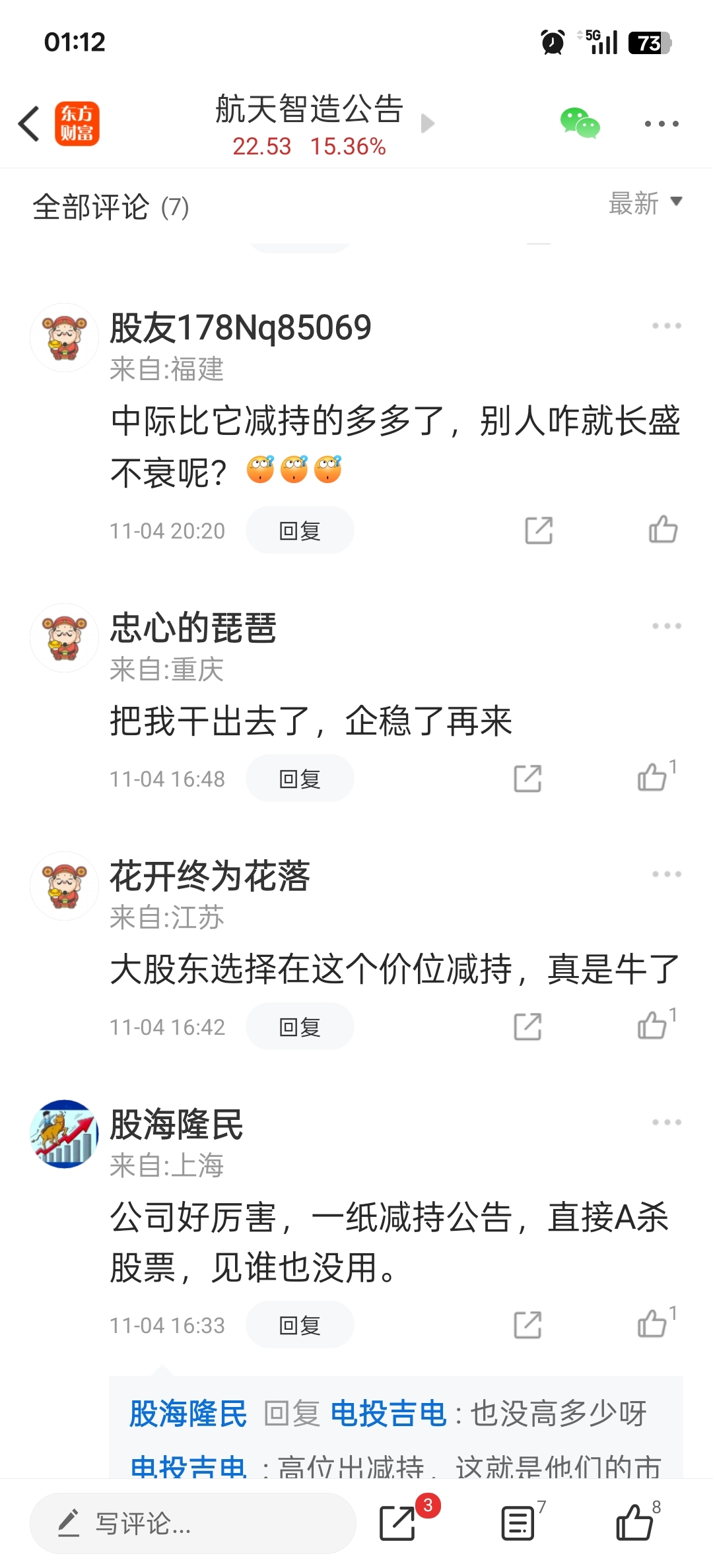 这个减持大家可以参考下航天智造吧,昨天航天智造也减持呢,但是人家股票长了15个点