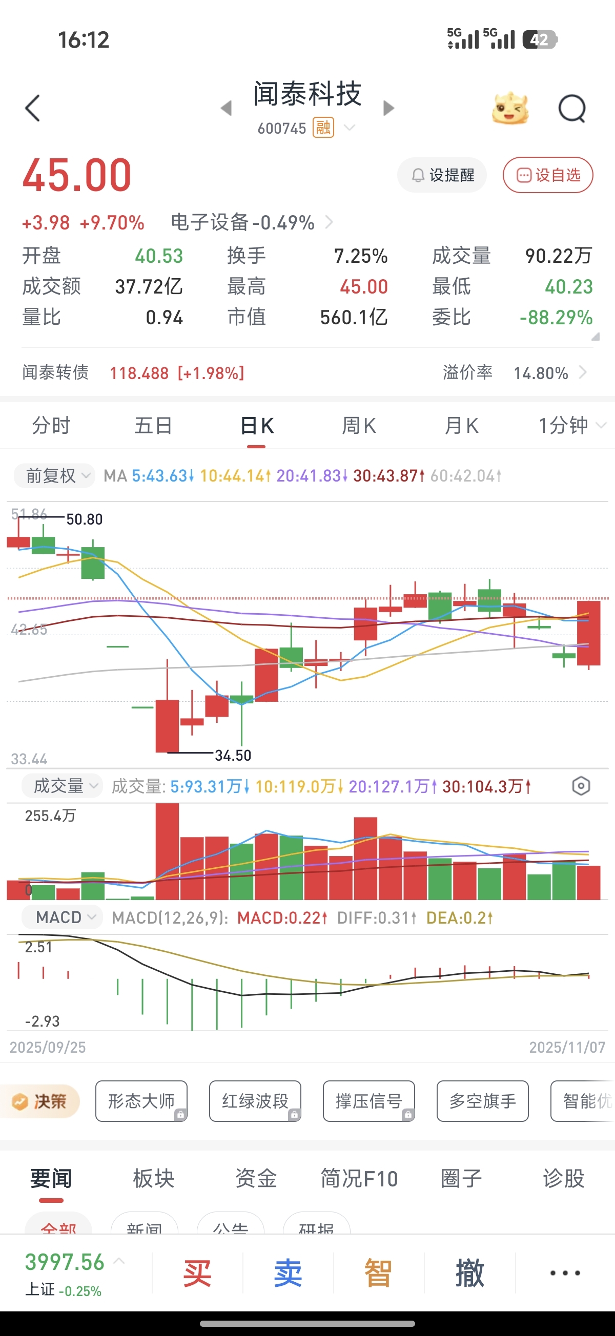 $闻泰科技(SH600745)$ 这个是最标准的“1阳穿5线”了吧?后市可期!