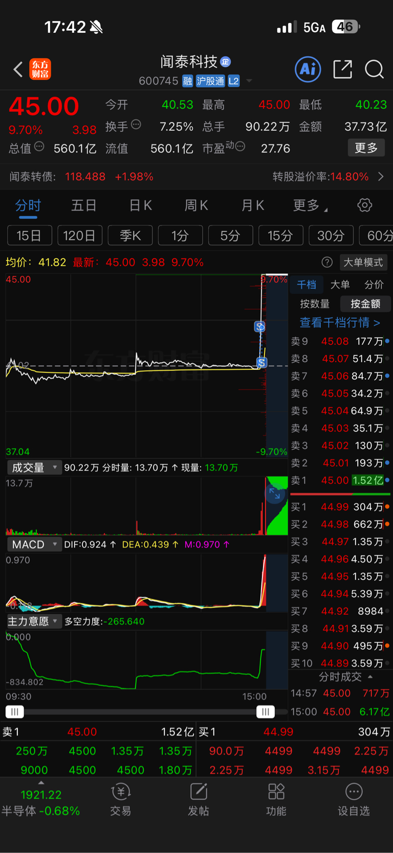 $闻泰科技(SH600745)$ 尾盘拉起来回本后全部卖了,感谢主力给机会撤退。拉升时间太短太快了,消息也滞后,玩不过主力,祝还在车上的发财。