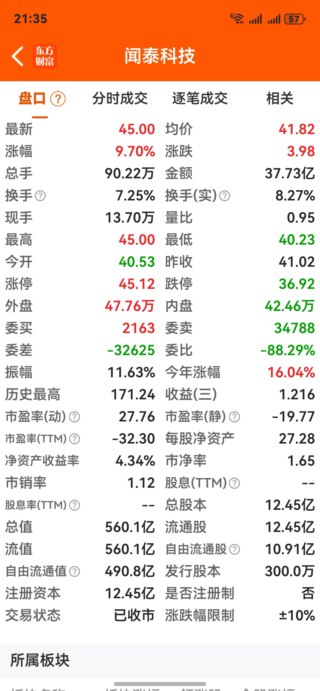 $闻泰科技(SH600745)$ 用较小成本把挂单都收了。下周一开盘一定在45元以上。