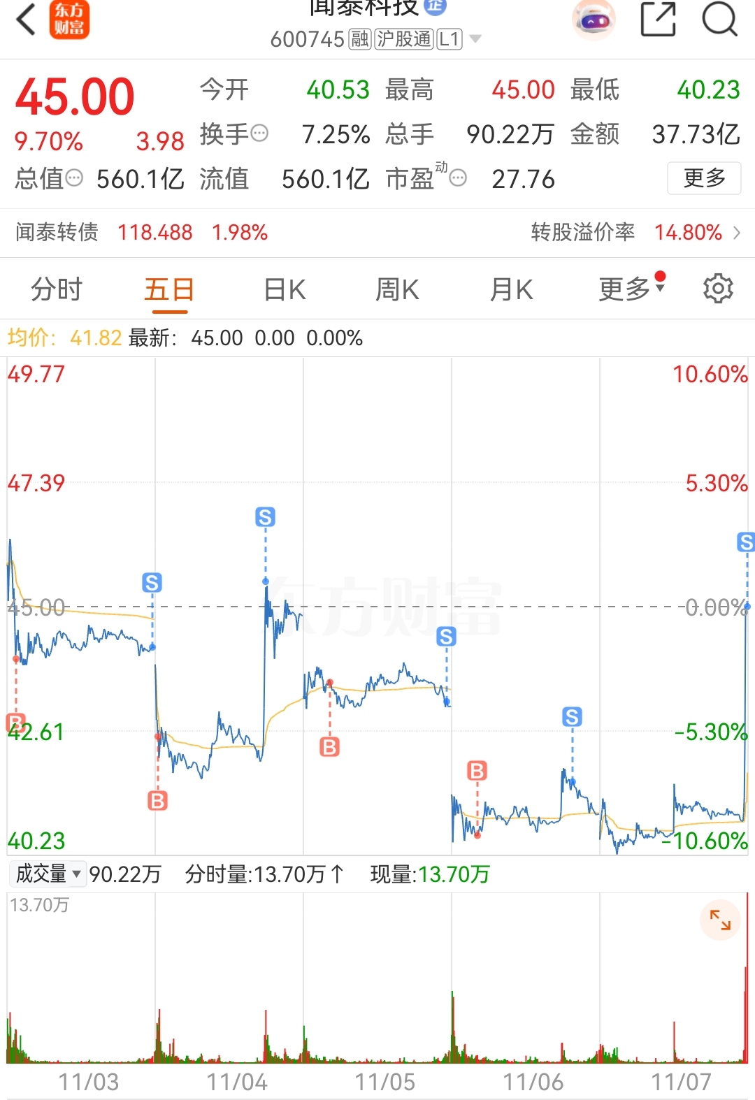 $闻泰科技(SH600745)$ 尾盘看见大涨竞价挂44元45元成交,先把今天的赚到手再说。