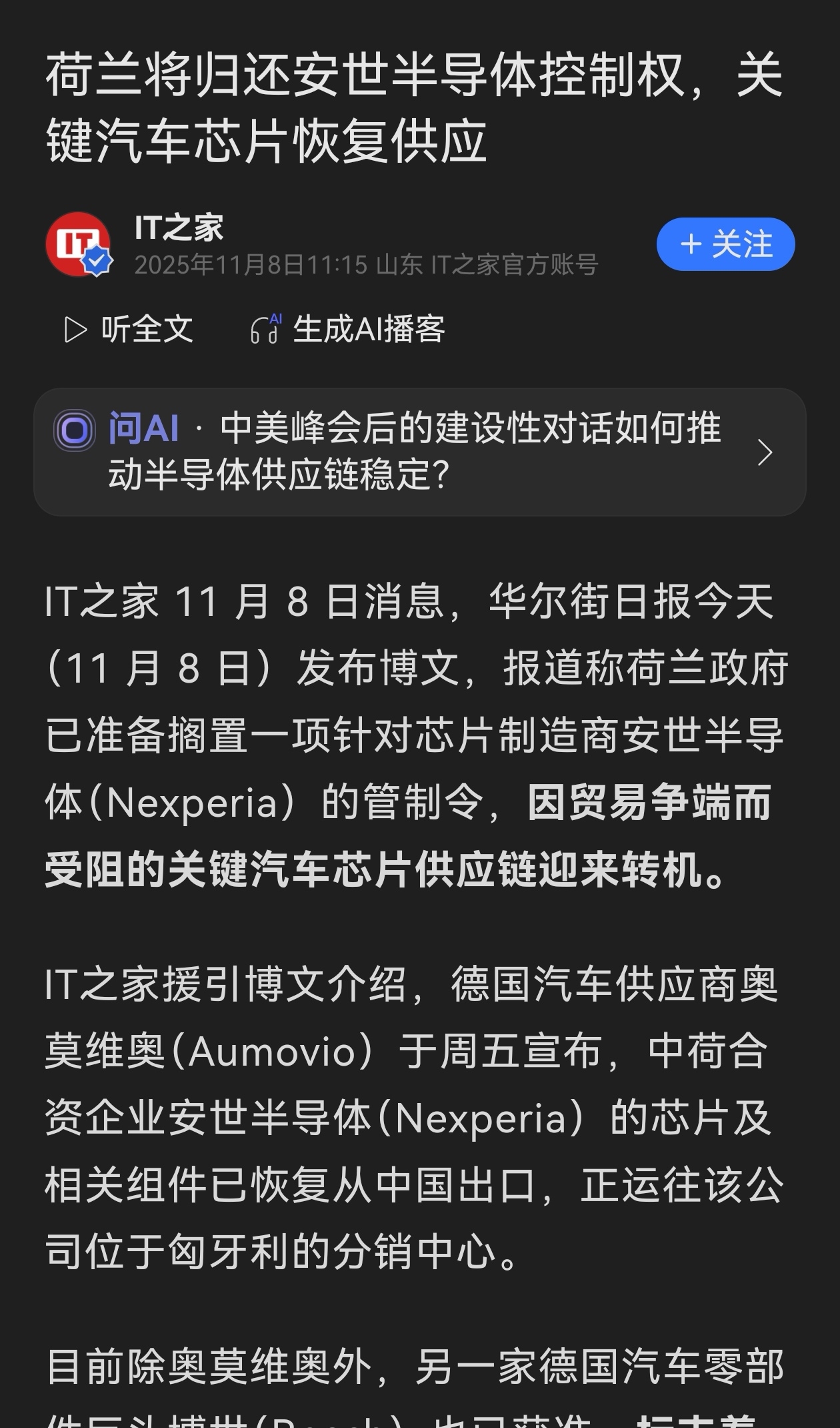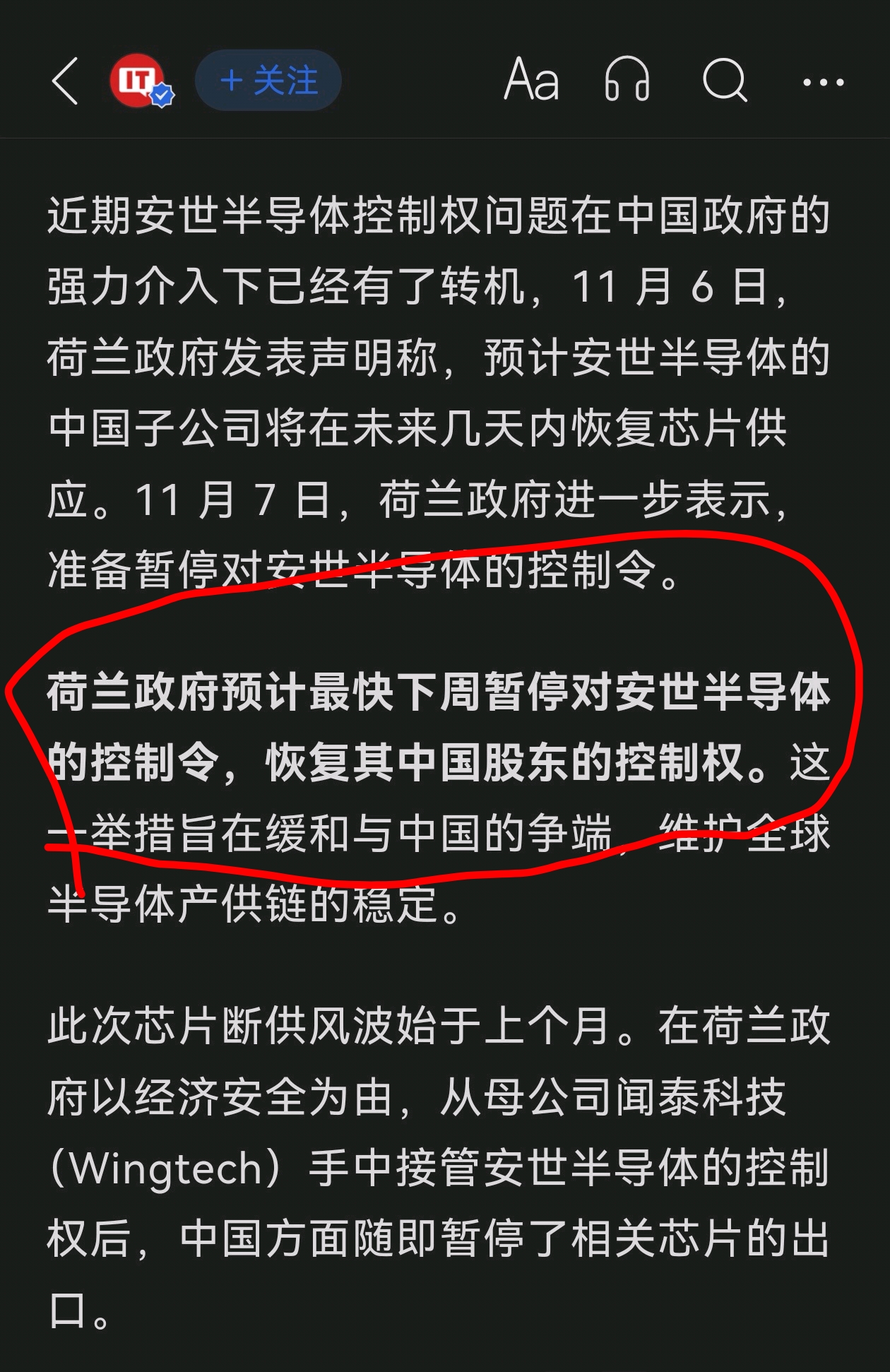 这才是尾盘拉升的主要原因,预计下周将归还闻泰科技对荷兰安世的控制权。