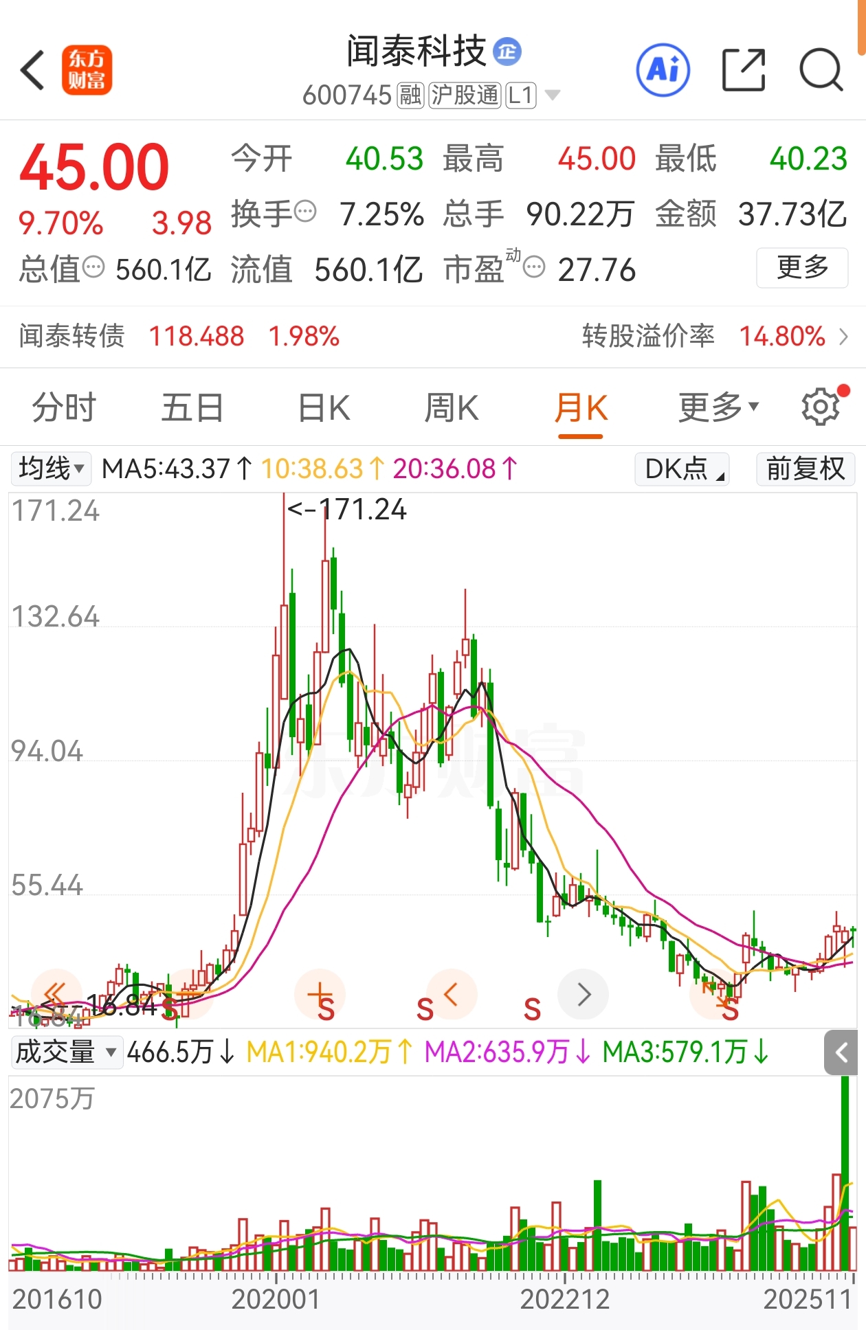 $闻泰科技(SH600745)$ 看看月线,炒股炒的是价值,这股绝对有价值投资,荷兰豆这次给打了全球广告,我炒股十年都不知道全球都在用它的车芯片,现在知道了。