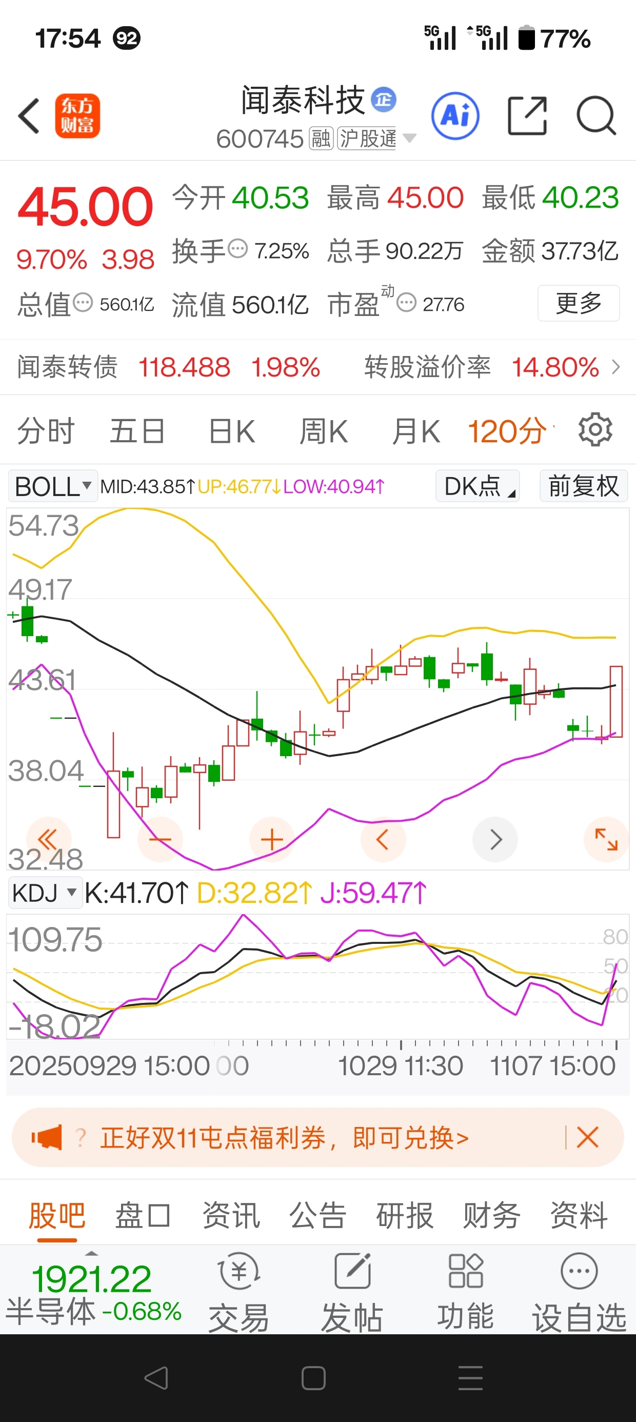 $闻泰科技(SH600745)$ 先看上轨线,46.42那里卖出