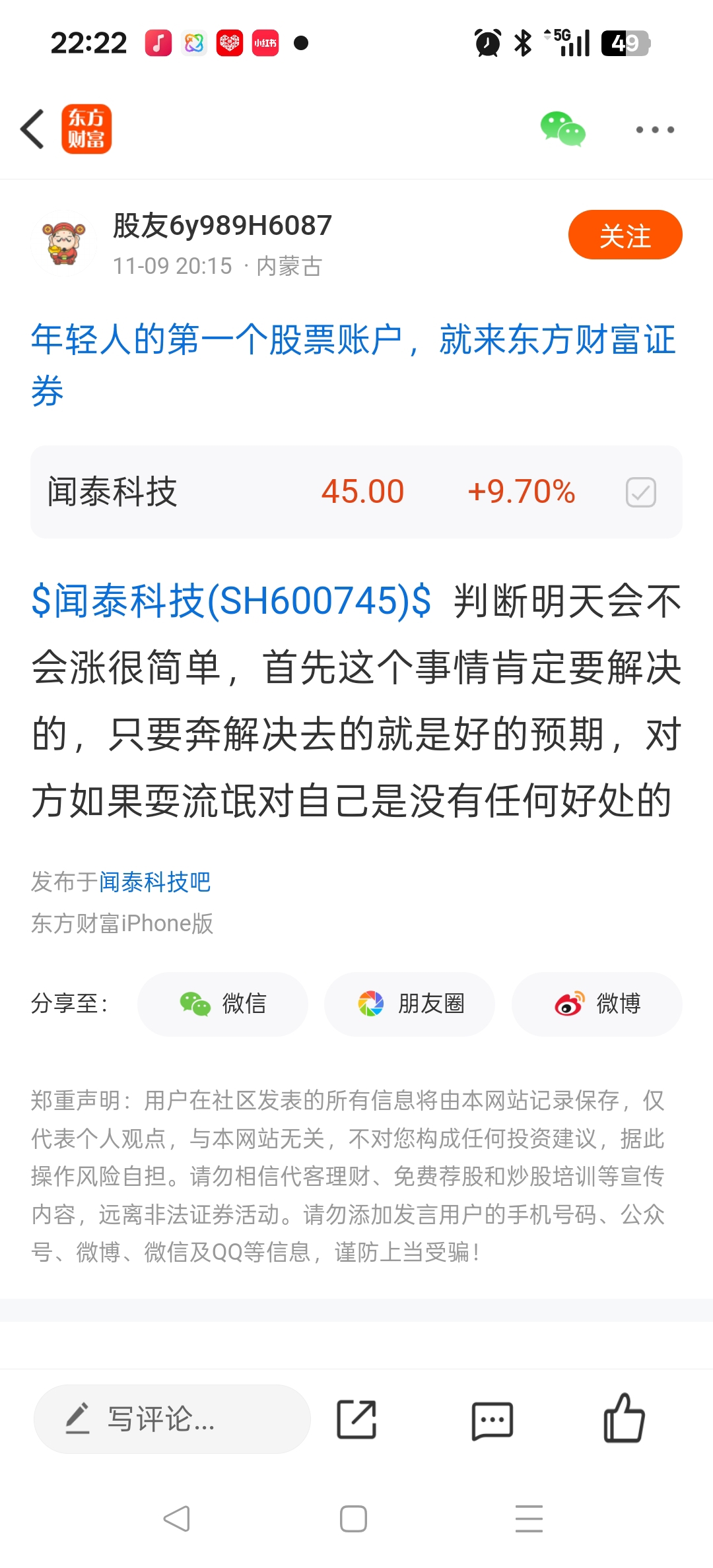温馨提示: 1.根据《证券法》规定,禁止编造、传播虚假信息或者误导性信息,扰乱证券市场;2.用户在本社区发表的所有资料、言论等仅代表个人观点,与本网站立场无关,不对您构成任何投资建议。用户应基于自己的独立判断,自行决定证券投资并承担相应风险。《东方财富社区管理规定》