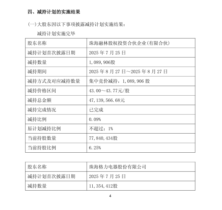 珠海融林原计划减持1%的,实际只减持了0.09%;格力电器原计划减持1%,实际减持0.91%。