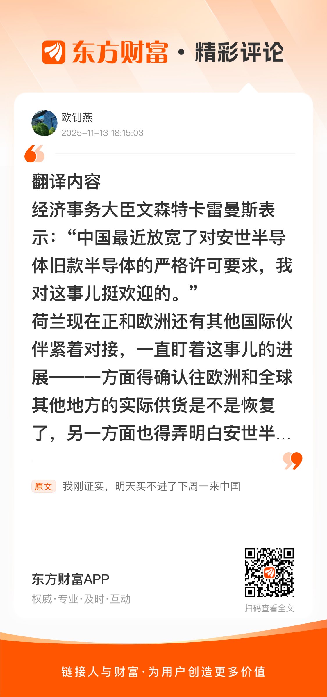 翻译内容经济事务大臣文森特卡雷曼斯表示:“中国最近放宽了对安世半导体旧款半导体的严格许可要求,我对这事儿挺欢迎的。”荷兰现在正和欧洲还有其他国际伙伴紧着对接,一直盯着这事儿的进展——一方面得确认往欧洲和全球其他地方的实际供货是不是恢复了,另一方面也得弄明白安世半导体在中国的工厂啥时候能彻底恢复正常贸易。这些关键芯片能不能稳定供应、咱们互相依赖的关系,对全球的产业和供应链来说太关键了。荷兰一直想和中国好好做外交沟通,所以中国愿意跟咱们进一步深化合作,包括当面聊,我们也特别欢迎。下周刚开始,我们部门会派个高级官员代表团去北京,接着商量怎么找到双方都能接受的解决办法。 我在《我刚证实,明天买不进了下周一来中国》的评论获得了大家的关注。