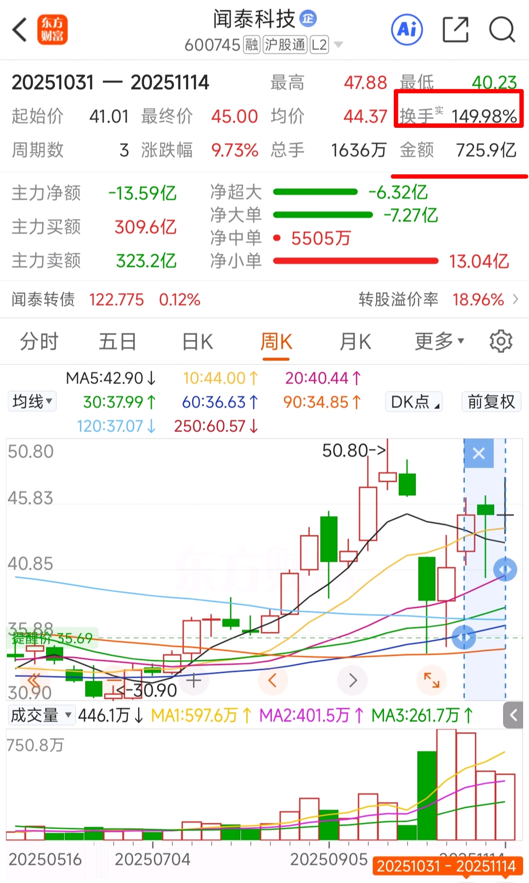 三周收盘价都是45元,换手率150%,成交额725亿,强庄实力不用多说,直接说结