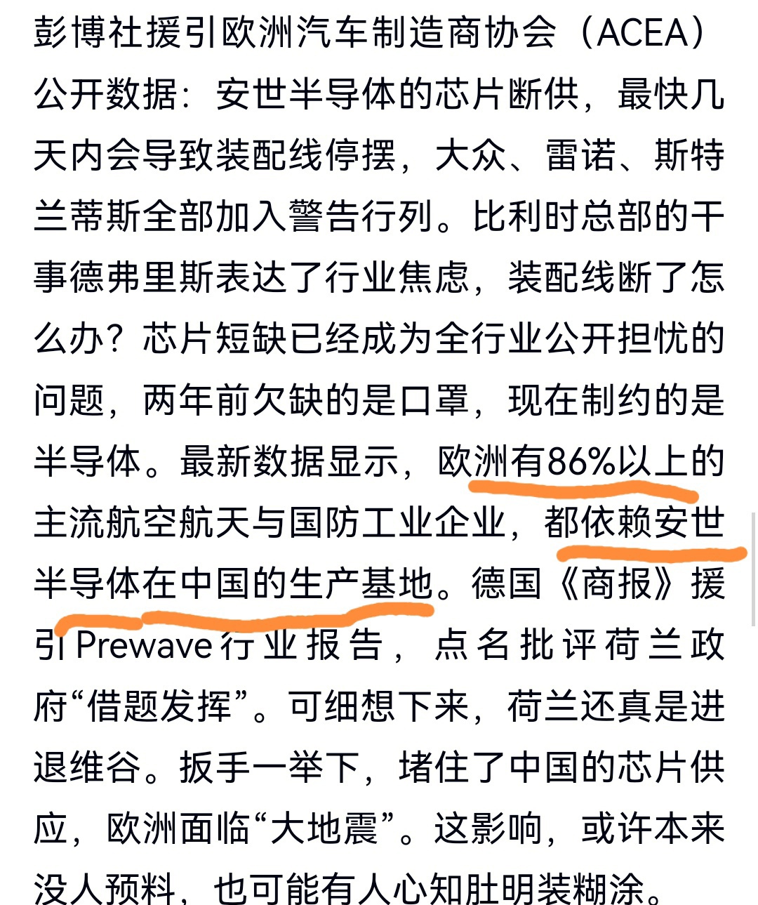 为啥荷兰要闻泰科技安世半导体,其安世半导体是欧洲汽车最先进和航天军工半导体核心唯一供货商。同时我国赶超汽车的原因