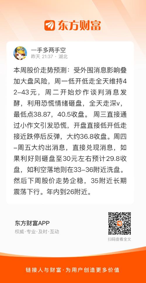 本周股价走势预测:受外围消息影响叠加大盘风险,周一低开低走全天维持42-43元,周二开始炒作谈判消息发酵,利用恐慌情绪砸盘,全天走深v,最低点38.87,40.5收盘。 周三直接通过小作文引发恐慌,开盘直接低开低走接近跌停后反弹,大约36.8收盘。周四-周五大约出消息,直接兑现消息,如果利好则砸盘至30元左右预计29.8收盘,如利空落地则在33-36附近洗盘。然后下周股价走势企稳,35附近长期震荡下行。年内到26附近。
