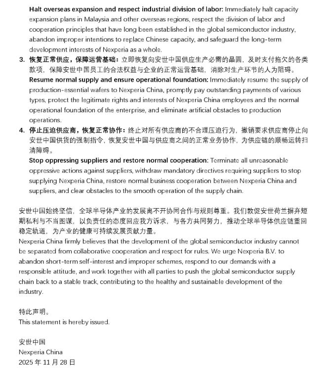 为维护全球半导体供应链的稳定畅通,保障产业链各方合法权益,安世中国郑重向安世荷兰提出以下要求: