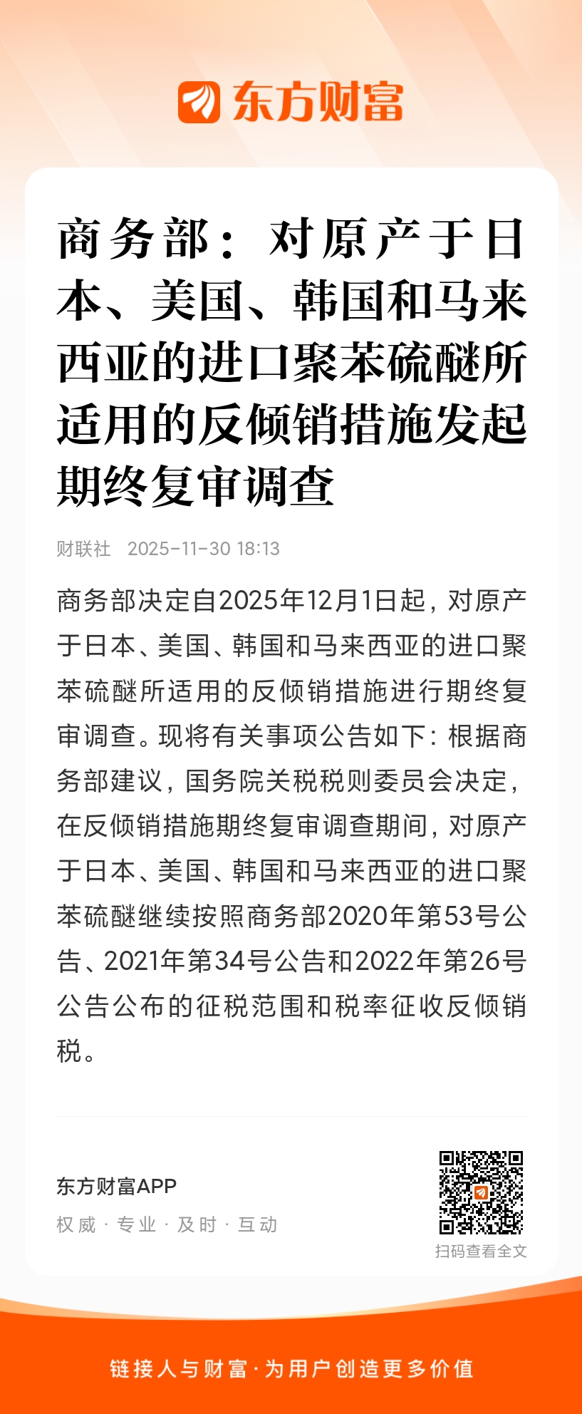 商务部决定自2025年12月1日起,对原产于日本、美国、韩国和马来西亚的进口聚苯硫醚所适用的反倾销措施进行期终复审调查。现将有关事项公告如下:根据商务部建议,国务院关税税则委员会决定,在反倾销措施期终复审调查期间,对原产于日本、美国、韩国和马来西亚的进口聚苯硫醚继续按照商务部2020年第53号公告、2021年第34号公告和2022年第26号公告公布的征税范围和税率征收反倾销税。