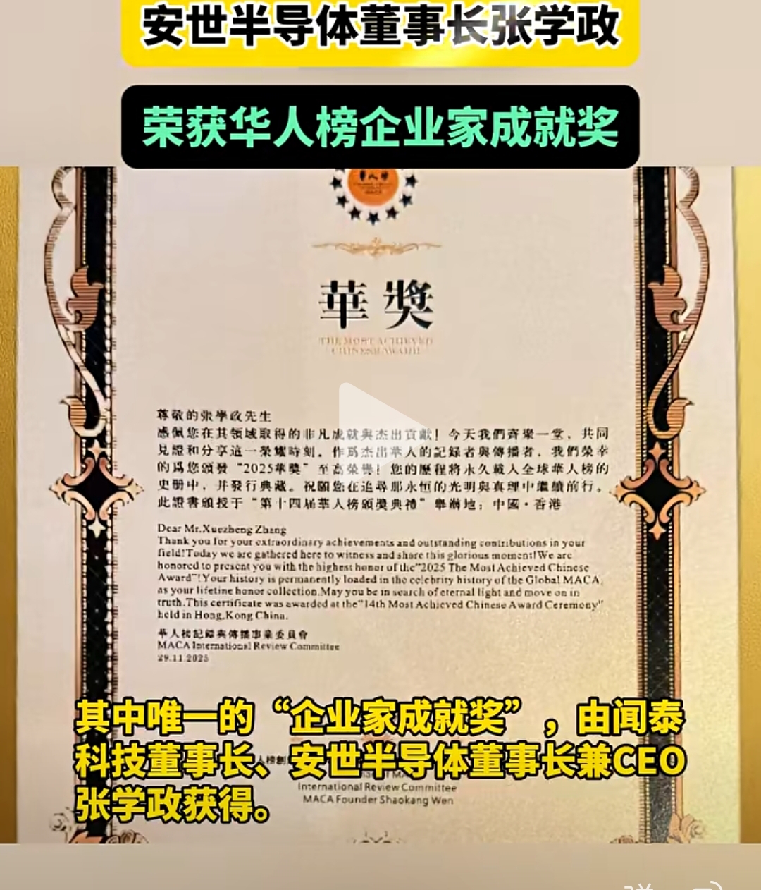 张学政先生唯一荣获华人榜企业家成就奖奖