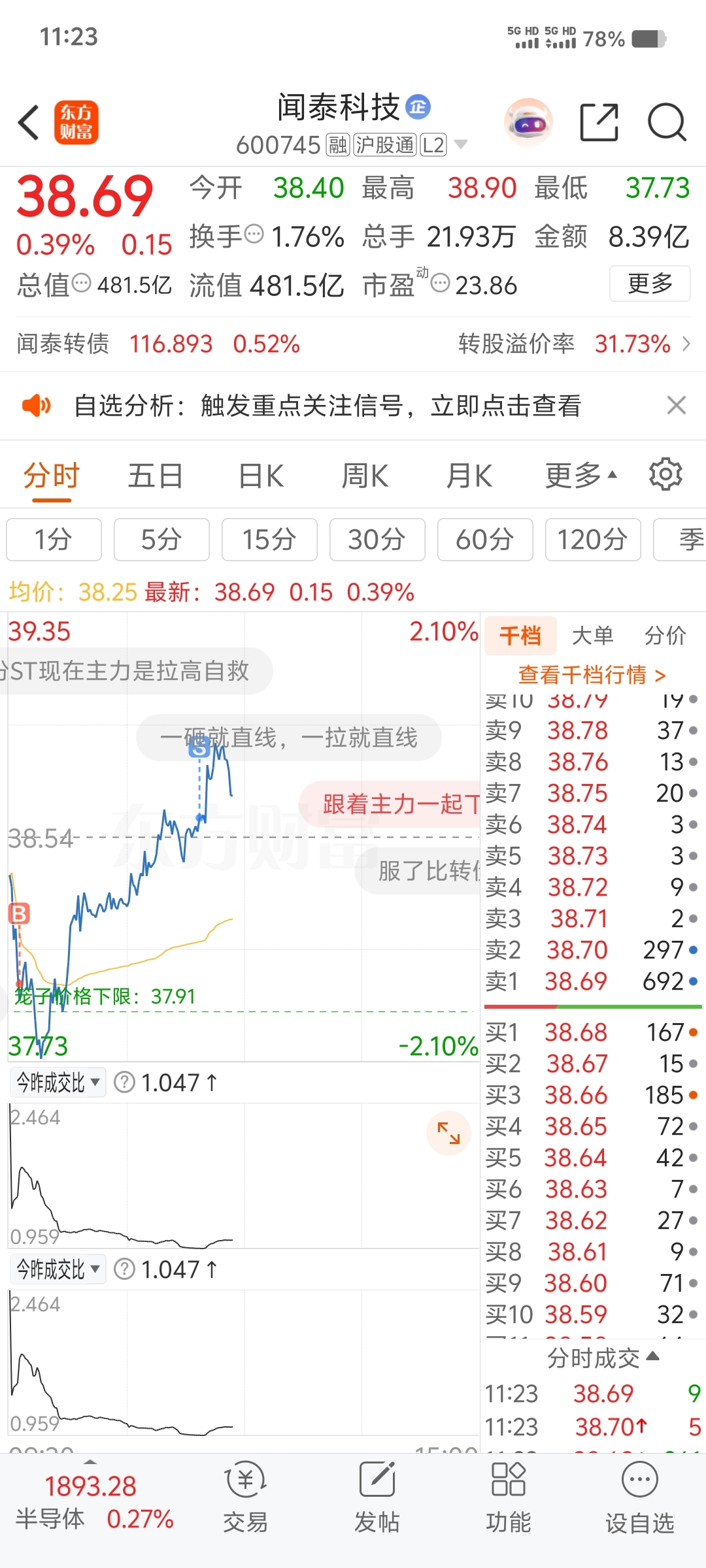 $闻泰科技(SH600745)$ 早上大着胆38加了几手,38.61出了