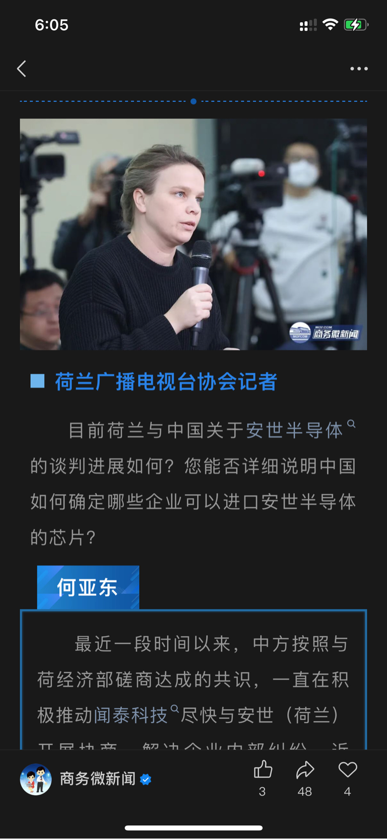 今天的新闻发布会关于安世半导体的问题是荷兰广播电视台提问的,叠加昨天科技部的会议