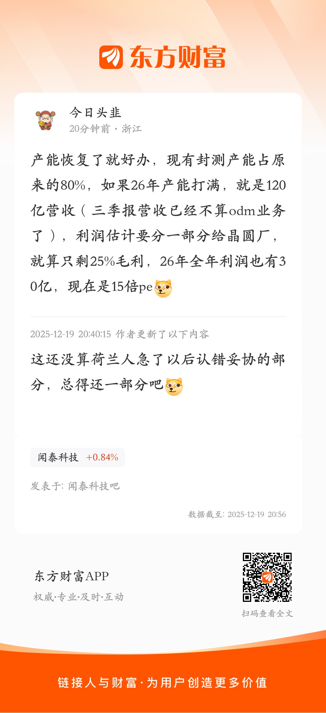 产能恢复了就好办,现有封测产能占原来的80%,如果26年产能打满,就是120亿营收(三季报营收已经不算odm业务了),利润估计要分一部分给晶圆厂,就算只剩25%毛利,26年全年利润也有30亿,现在是15倍pe