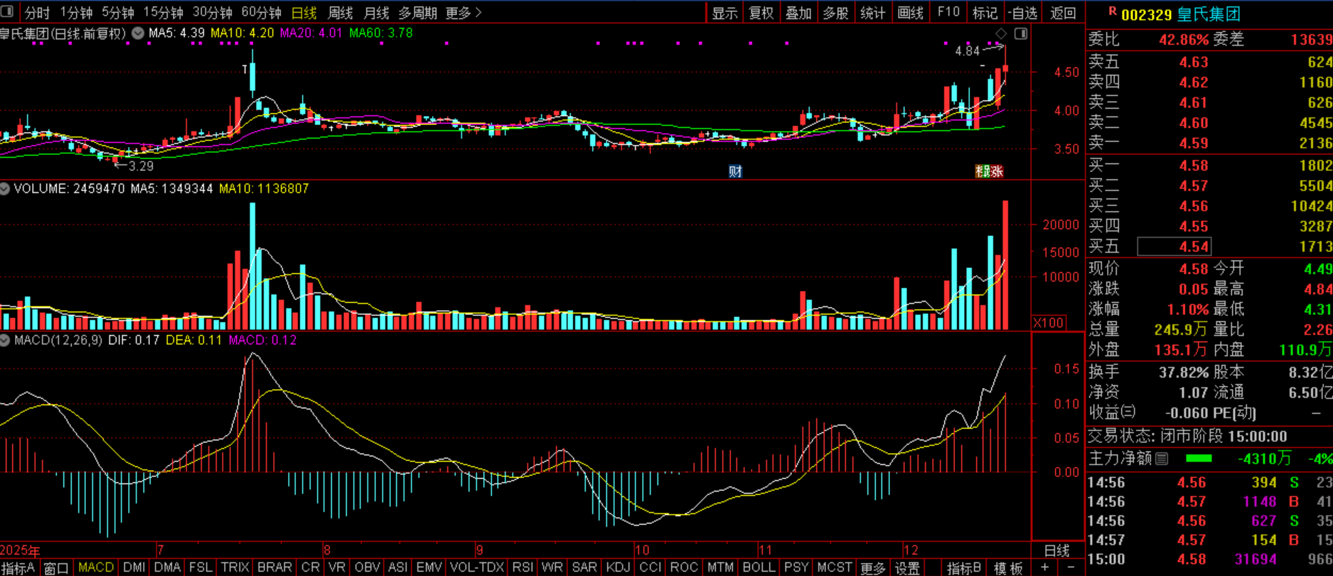 皇氏集团(SZ002329):水牛奶+三胎概念+奶啤乳业+光伏+种源突破+跨境电商。今日此股开盘就急速探底,不过5日线附近猪力强势护盘坚守,其后该股走高,不过遇阻强阻力位4.80附近,之后回落,量能创历史最大,不过股价仍小幅收涨,位于近期高价区,笔者以为这是猪力的试探性进攻,冲高回落就是震仓洗脱前期套牢盘的手法,对于后市坚定看涨,遗憾的是快速拉涨可能就得延后了。